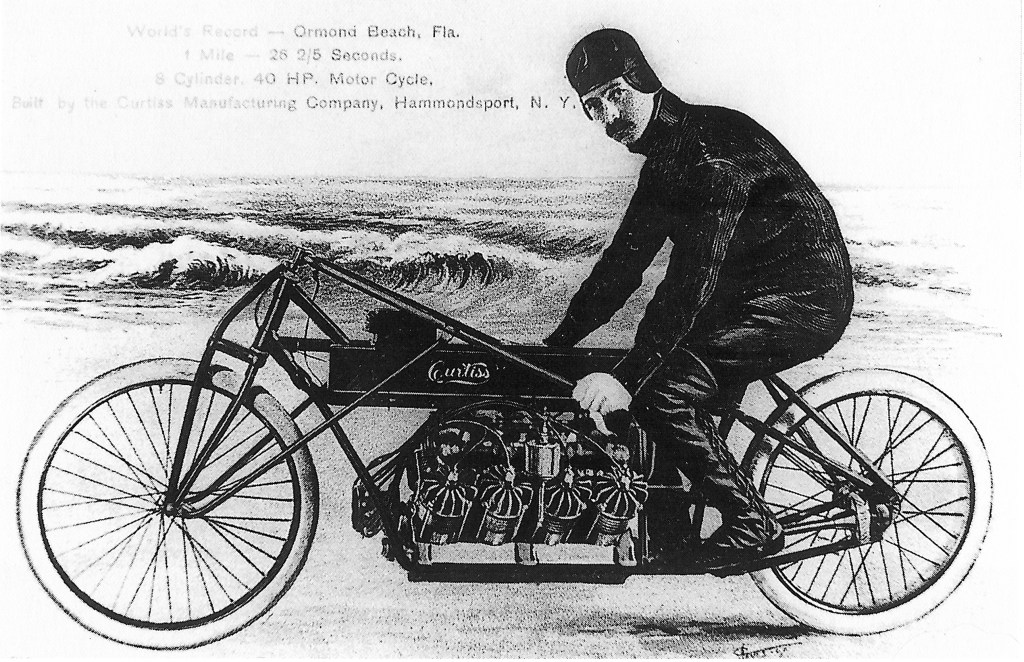 Another man, less famous, but also fascinated with flying, was Glenn Curtiss of New York (1878-1930). His career started with racing bicycles and motorcycles. In 1907 he set an unofficial world speed record of just over 136 mph on a 40 horsepower V-8 powered motorcycle that he designed. That record was not broken until 1930. Curtiss is credited with designing the handlebar throttle. More importantly, his powerful, but light, engines were much in demand for a variety of uses. [1]
